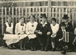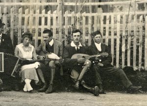 In kakšne okovane čevlje ima harmonikar!Če so imena zapisana po vrsti, bi bil to Ipavčev France s harmoniko, ki je znanec iz prispevka 1925 Markovec – Fantje, drugi z desne. Vendar pa je v drugem prispevku z imenom Markovški fantje kot Ipavčev France poimenovana povsem druga oseba, tako da tukaj nekaj ni čisto prav. Kdo pa je starejši možakar? Morda Raušelnov oče? Ali Janezkov? Ugibanje brez upa zmage.