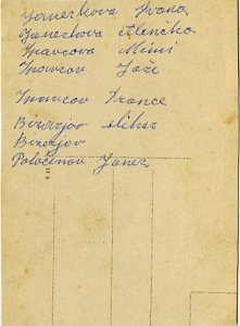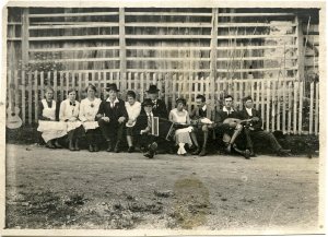 Trije na posnetku pa so, sodeč po zapisu, vsekakor Ipavčevi iz gostilne, kateri nemara pripada tudi poslopje, kjer so slikani: Ipavčeva Mimi, ki je prijela nečaka (?) Jožeta pod pazduho, medtem ko France sedi pred njima na tleh; dve Janezkovi sta na začetku vrste in dva Bizarjeva proti koncu, zadnji pa še Potočanov Janez, prav sproščeno sedeč s klobukom poleg sebe. Je drugi Bizarjev, tisti poleg Janeza, Vinkov oz. Cenetov brat?Na sliki so videti kot glasbeni ansambel – tamburaška skupina s harmonikarjem – in morda so res. Ob plotu imajo prislonjeno kitaro, eden ima v rokah harmoniko, dekle poleg njega pa nekaj kot majhno brenkalo ali morda citre na kolenih, sledita dve mandolini. Je bil Cene Bavec tudi muzikant? Po sorodnikih sodeč prav mogoče. Na roki ima tokrat mavec ali obvezo in ne more igrati, tudi če je znal. Kaj se mu je zgodilo?