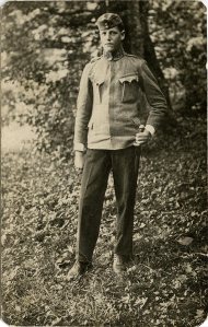 Obraz tega fanta me na nekoga spominja, to je pa tudi vse, kar lahko rečem o tej sliki. Še v to, da je iz prve svetovne vojne, nisem trdno prepričana. Poznavalec bi iz kroja svetlejšega suknjiča in temnih hlač ter okrasja na obleki in kapi ugotovil, kam je vojak spadal in iz katerega obdobja je slika. Nekoč mi je Marko Gorše razložil, da so v avstrijski vojski najprej imeli uniforme s svetlim suknjičem in temnejšimi hlačami – sem si prav zapomnila? Bi se podatek lahko nanašal na to fotografijo? Tudi okolje na sliki je neprepoznavno – košatih bukev in trave je povsod polno.