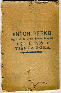 Na kartonu je zanimiv podatek: ANTON PERKO, trgovina iz specarijskim blagom 29. I. 1903 VIŠNJA GORA.