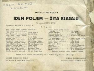 Gledališki list je bil izdan pred proslavo dvoletnice otvoritve Doma. Na proslavi so uprizorili dramo majorja Jerka Juričića z naslovom »Idem poljem-žita klasaju« (Grem po polju-žito zori; kaj dejansko pomeni »klasaju« nisem našla ne v slovarju, ne na spletu, niti Srb ni vedel, baje je to star izraz, Google pa prevede, da se žito žanje. Najbolj smiseln prevod je – žito dela klasje.) Drama je imela pet dejanj in jo je pisal pet let. Režiral jo je avtor sam. Veliko igralcev je bilo domačinov. Igre niso uprizorili v celoti zaradi tehničnih in igralskih težav. Zgodba se odvija med vojno. Major je v zgodbi zajel zmago jugoslovanskih narodov nad fašizmom. Dogodki so vzeti iz Podgore v Dalmaciji, ki jim je bil avtor sam priča v letih 1943-1944. Na Rakeku je bila uprizorjena prvič.