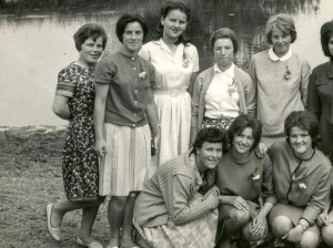 V šolskem letu 1963/64 sta startala v osmi razred 7. a in 7. b, združena v en razred (bilo jih je preko trideset). Njihova učilnica je bila na podstrešju takrat že bivše nižje gimnazije, ker je bila največja na šoli. Njihov razrednik je bil učitelj fizike in matematike Emil Mercina. Ob zaključku šolskega leta niso šli na zaključni izlet. Zakaj? Ne vem. Morda so bili kaznovani. Tudi valete takrat še niso uvedli v šolo. Sklenili so, da bodo zadnji šolski dan po obveznem delu v šoli, preživeli po svoje. V šolo so prišli praznično oblečeni in si pripeli bele nageljčke. Po skupni fotografiji z razrednikom pred šolo so se dekleta napotila na sprehod proti Pudobu, kjer je nastala ta slika. Domnevam, da jim je ta kraj svetoval fotograf. V ozadju se širi Obrh, v katerem se zrcalijo mogočne vrbe in močvirska trava. V levem kotu je viden del hotela ali okolice.