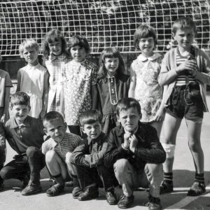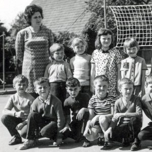 Prvi razred v šolskem letu 1971/72 je v podružnični šoli Grahovo obiskovalo 19 učencev. Pravzaprav jih je toliko na sliki in samo upamo lahko, da ni kdo manjkal na dan slikanja. Slikani so na igrišču pred šolo. V ozadju je napeta mreža za igranje odbojke. Slikani so ob svoji razredničarki Ivanki Kranjc.