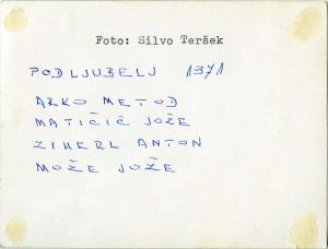 Imena je zapisal Metodov sin Anton Arko. Prvi na desni je Metod Arko, na levo stran pa si sledijo: Jože Matičič, Anton Ziherl, Jože Može. Fotografijo je leta 1971 posnel Silvo Teršek, radijska legenda s prepoznavno čepico.