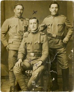 Tukaj je med dvema nam neznanima vojnima tovarišema mladi Jožef Miklavčič v uniformi avstro ogrskega vojaka. Položaj njihovih rok nakazuje medsebojno povezanost, saj se med seboj dotikajo, pa čeprav morda le na fotografovo sugestijo. Pri levem fantu se zdi, da so na ovratniku tri planike, ki mogoče nakazujejo pripadnost planinskemu polku – ampak to so zgolj ugibanja.