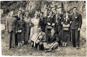 1937 Babno Polje – Novoporočenca, svatje in muzikant Ivan Šega