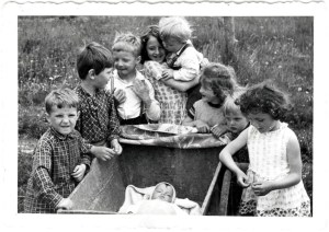 V tistih časih nismo poznali otroških vozičkov. Ker sta bila pri hiši dva majhna otroka, je bila najboljša rešitev najmlajšega dati kar v kareto. Tu je lahko v miru spal. Kot vidimo na sliki, je na kareti tudi odeja (deka) za primer, če bi sonce premočno pripekalo. Janja je oblečena v eno tistih oblek, ki jih je sešila naša mama Cvetka, o čemer sem pisala v prispevku Oblačila vaških in mestnih otrok: oblekica brez rokavov, volanček na vratnem izrezu in spodaj ginjerca iz ostanka nekega drugega blaga. Franciju hlače gor držijo “šjre”, kot pravimo elastičnim naramnicam. Ker smo otroci nosili oblačila drug za drugim, smo z njimi rešili problem prevelike številke hlač. Spomnim se, kako sem vsako leto Miklavžu pisala za nove šjre, saj se je elastika hitro pretegnila. Franci pa nosi tudi belo srajčko, kar za kmečke otroke ni bilo najbolj prikladno, saj smo se v igri kaj hitro umazali. Slavko in Hermina sta bila otroka privatnikov, njun oče je bil avtoprevoznik, mama pa gostilničarka. Ostali otroci smo si predstavljali, da je biti otrok privatnikov “nekaj več”. Sicer ne vem, zakaj smo bili takega mišljenja, saj sta nam bila povsem enaka, skupaj smo se igrali, ničesar “več” nista imela kot ostali. Verjetno smo to pobrali od odraslih, ki so se bolje spoznali na te stvari.