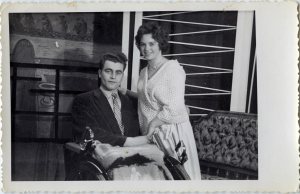 France Tavželj in Marija Obreza v enem od prizorov v igrani predstavi, tam nekje okrog leta 1959. Imamo štiri slike iz iste igre, katere naslova žal ne vemo. Klasična vsebina, s tremi glavnimi akterji. Mož, žena, ljubimec in vse kar spada zraven. Za popestritev je bil tukaj mož invalid na vozičku.