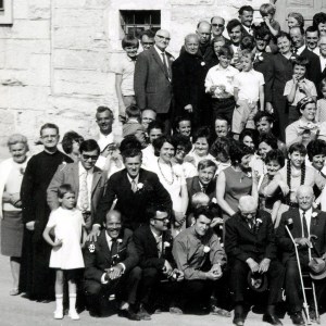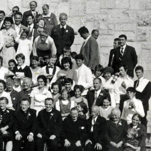 4. julija 1971. To je bil praznik za vso faro. Skupinska slika je nastala pred cerkvijo Srca Jezusovega na Rakeku, kjer je imel svojo prvo mašo v domači župniji.