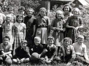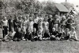Učenci 4. razreda so se v šolskem letu 1953/54 slikali na vrtu, na katerem so večkrat igrali razne igre z žogo, tudi odbojko. Z njimi je razredničarka Ivanka Šuligoj. Zadaj je viden skedenj, Petkova hiša in cerkveni zvonik.