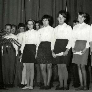 Starejša nastopajoča dekleta so šolo zaključila leta 1964. Oblečene so v klasičnih oblačilih za nastop: bela bluza in temno krilo. Pa najlonke, ki so se tako rade raztrgale in v trenutku je nastala dolga črta, ki se je kar daljšala … Najlonke so tedaj še šivali. V Cerknici je dolga leta Mikšetova gospa reševala te težave. Tudi jaz sem, kot mala deklica, tja nosila šivat najlonske nogavice svoje mami. Kako je to gospa delala, ne vem. Če se prav spomnim, je imela tam v veži en stroj. Vem pa, da so bile spuščene zanke v dolgi črti pobrane. Le mala zašita luknjica je ostala za spomin.