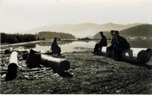 Le umetnik vidi in zna ujeti pravi trenutek. Jože Žnidaršič je to nedvomno bil. Glede na vodostaj in oblačila možakov, ki posedajo na hlodih, je slika nastala spomladi ali jeseni. Sence padajo na desno. Sonce se je dvignilo nad Slivnico. Nad jezerom se dviga meglica in zakriva Javornike. Najlepša jutra so zjutraj, je zapisal Ivan Volarič – Feo. Jaz pa pravim: najlepši dopoldnevi so dopoldan ob Cerkniškem jezeru. Diši po jezerski travi, ki me je tolikokrat porezala, ko sem jo tlačila na vozu. Vetrič vleče z Javornikov, sonce greje stare kosti. Na tako lepem kraju in v lepem vremenu bodo pa že kaj pametnega pogruntali.