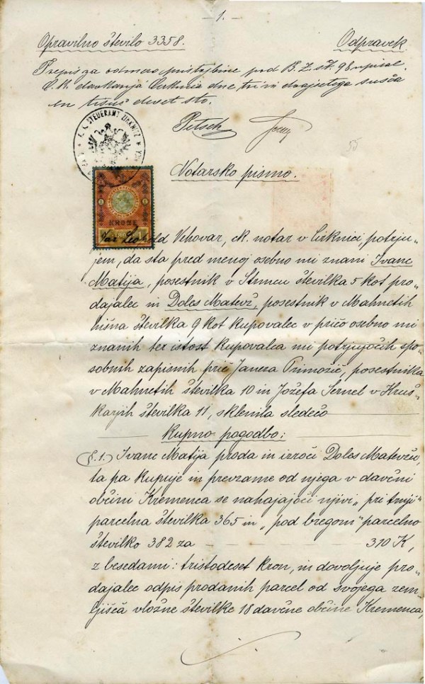 Zanimivo je Notarsko pismo o nakupu njiv v davčni občini Kremenca, ki natančno določa vse pogoje nakupa. Na osnovi tega sklepa iz dne 26. 9. 1901, opravilna številka 698 se je opravila vknjižila zastavna pravica na Doles Matevža.