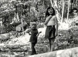 Na sliki sta Petra in Janja Kranjec. Posneta je bodisi v Gladovcu, ali pa v Pušči, torej v enem izmed gozdov, ki pripadajo hiši še dandanes, in se razprostirata na področju Menišije. Rekla bi, da je posnetek nastal “med mašami”, to je v času, ki je po starem izročilu najbolj ugoden za sekanje dreves, naš ata se je tega izročila zelo zvesto držal. “Med mašami” pomeni čas med Veliko in Malo mašo, druga polovica avgusta in začetek septembra.