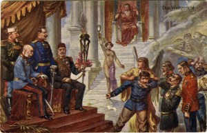 Vsekakor slika prikazuje osebnosti, ki tisti čas vplivajo na življenje milijonov: na levi poleg cesarja Franca Jožefa na visokem podiju sedijo in stojijo še možje, ki morda vodijo Prusijo, Osmansko cesarstvo, Bolgarijo ali Italijo, ki še ni prestopila na drugo stran – Centralne sile /alianso v prvi svetovni vojni. Spodaj bi po uniformah morda lahko razbrali njihove nasprotnike – Ruse, Francoze, Britance, morda Romune, Japonce … spet samo ugibam. Je pa zgovorno, da so ti spodaj prikazani kot slabi in hudobni, saj gre za avstro-ogrsko sliko.