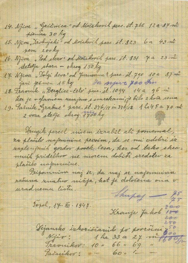 Za potrebe izračuna najemnine je moral Jakob popisati zemljišča in pridelek. Pri natančnem opisu parcele je zapisal, koliko in kakšen je bil pridelek ter tudi vrednost le-tega. Popis nosi datum 17. december 1947.