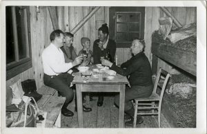 Vesela druščina se je zbrala v lovski koči. Sklepam, da so prišli na polhanje. Ali pa tudi ne. Niso preveč toplo oblečeni. Morda je bila lepa jesen, kot letos. Obuti so v črne gumijaste škornje, ki smo jih kupovali v trgovini s čevlji Borovo. Ponekod jim rečejo batovci, ker so jih nekdaj prodajali v trgovini Bata. Skrinjice so nastavljene, treba je le še počakati na ulov. Ta čas bodo nekaj pojedli in popili, da bo čas hitreje minil. Morda bodo tudi kakšno kitico ali dve odspali na pogradu, natlačenim s senom. Za razsvetljavo služi sveča. Na desni je Franjo Vengust.