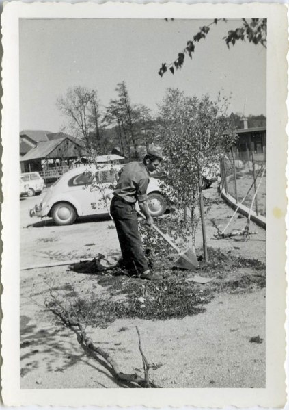 Vzdrževalci so bili nekakšne “deklice za vse”. Kjerkoli se je pokazala potreba, so oni nastopili. Tako so prekrivali strehe, vzdrževali vse možne objekte in tudi okolico. Na pričujoči sliki ata sadi drevje. Videti je, da v neposredni bližini teče Cerkniščica. Verjetno je to mesto desno od vratarnice pri zdajšnji Mineralki ob potoku, kjer so delavci parkirali svoje avtomobile. Teh dreves, ko so bila večja, se dobro spomnim. Dobro je delo, če je bil atov avto v vročih dneh pod enim izmed njih, saj so dajala prijetno senco. Kasneje so tu zgradili nadstrešek za parkirane avtomobile. Najpogosteje je bilo tu najti Zastavo 101, fička, katrco, spačka, lado, tudi kakšnega opel kadeta, NSU prinza, wartburga … in našega Ami 8 break. Ta drevesa so danes že zelo visoka in košata.