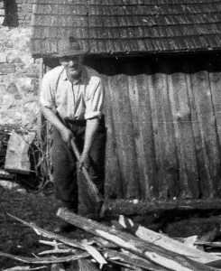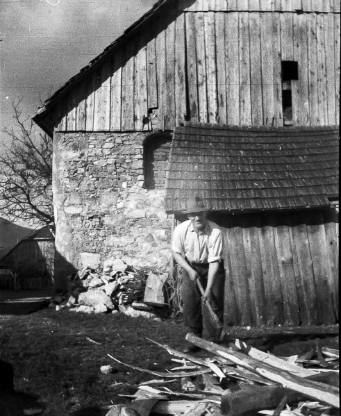 Imela sem pet let, ko je nekdo, najbrž stric Henko, pripeljal v Podcerkev voz ali dva smrekovih hlodov. Na traklne so jih zvalili za Fricovim skednjem, ki je bil precej podoben stavbi na sliki, le manjši in v celoti lesen. Ne vem, čigavo je bilo tisto malo zemljišče, vsekakor ni pripadalo domačiji, kjer smo živeli in se je oče moral z nekom dogovoriti za dovoljenje. Potem se je lotil tesanja. Posamezen hlod je podložil s prečnimi debelimi kosi lesa kot mož na sliki in ga ob straneh ušprajcal, da se ni zvračal. Po dolžini je napel vrvico in ob njej s kosom krede ali tesarskim svinčnikom označil, kje bo tesal. Ni označeval, kakor opisuje Prežihov Voranc v eni od svojih črtic tako, da bi z barvo namočil vrvico in jo potem napeto spustil na hlod, vsaj spomnim se ne. Potem je stopil na hlod in začel tesati po črti s posebej oblikovano sekiro, verjetno s plenkačo. Poleg navadne sekire in plenkače je imel tudi švarbo in žatlako. Silovito je mahal s tisto sekiro in od hloda se je ločila dolga trska, ki se je le redko prekinila. Ko je hlod obtesal z dveh strani, ga je obrnil in obdelal še po drugih dveh. Meni je bilo všeč, ker je les ob vsakem udarcu s sekiro kar zabrnel, kazale so se tudi kapljice smole, ki je zelo lepo dišala. Tudi očetove trde in žuljave roke so bile zamazane s smolo, od čela pa mu je kapal znoj. Moralo je biti spomladi, ker je vse naokoli cvetel regrat, goste travne bilke pa so se svetlikale v soncu. Ne vem, kdaj je našel čas in moč za tisto tesanje, saj je delal na Marofu na placu od osmih do štirih s prav takimi hlodi, kot so tu ležali pred njim. Je vzel dopust, je tesal v nedeljo in za praznike, mogoče prvi maj, kajti prostih sobot še ni bilo? In kako je zmogel po naporni službi še to težaško delo?
