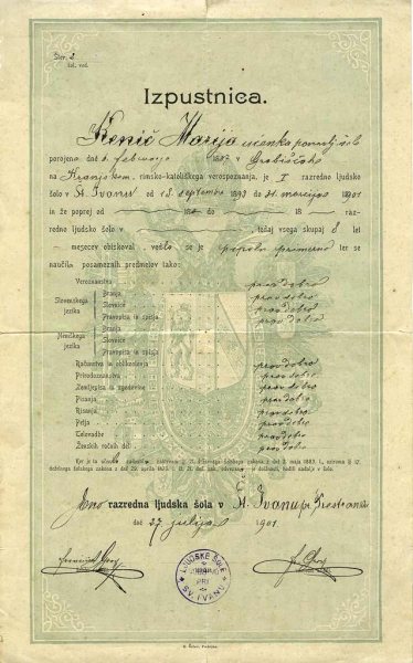 Na prvi pogled je »Izpustnica« podobna spričevalu. Šele po podrobnem pregledu se vidi, da je neke vrste dokument o zaključku šolanja. Na dokumentu je razvidno, da je obiskovala I. razredno šolo pri Sv. Ivanu od 18. 9. 1893 do 31. 3. 1901, vsega skupaj 8 let. Sledijo ocene za posamezne predmete. Na zaključku je pravno mnenje, ki odvezuje učenko od dolžnosti nadaljnjega obiskovanja šole. Datum izdaje dokumenta je 27. 7. 1901. Žig: Ljudska šola pri Sv. Ivanu.
