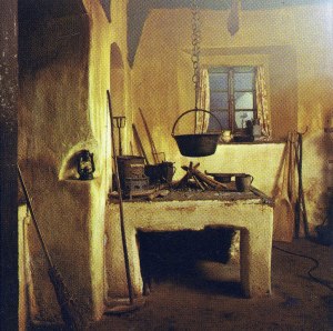 Črna kuhinja v Češencovi domačiji je danes urejena nekoliko drugače. Ognjišče je prebeljeno in brez dodatkov na njem, nad njim visita dva kotla.