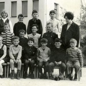 Razredničarka Ida Zorman in njen 2.b razred pred osnovno šolo v Cerknici. Tokrat so se postavili pred šolsko igrišče, s šolo v ozadju. Kako čas hitro teče. Niso več najmlajši na šoli, ampak že gredo proti koncu drugega razreda.