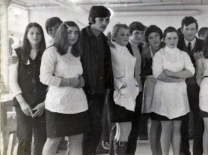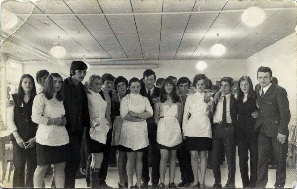 Ob pogledu na skupino fantov z dekleti v belih predpasnikih, ki so jih gostile s hrano in pijačo, sem najprej pomislila na veselico v TVD Partizanu v Starem trgu. Ko pa sem sliko natančneje pogledala, sem po stropu ugotovila, da se krepko motim. Spominska fotografija je nastala po pogostitvi tekmovalcev iz tovarne Titan Kamnik v menzi Kovinoplastike. Z njimi so se slikala tudi dekleta – članice ZMS, ki so jih pogostile, in takratni predsednik mladinske organizacije v Kovinoplastiki Lož Stane Kočevar.