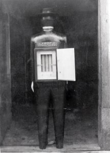 Na zgornji sliki je lipov kip Antona Janše v naravni velikosti. V njem je vgrajen panj za čebele. Fotografije so iz takratnega obdobja v slabi izvedbi.
