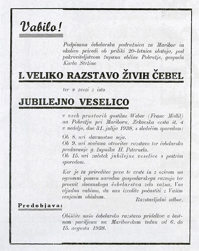 Na sliki vabilo za I. veliko razstavo živih čebel in jubilejno veselico