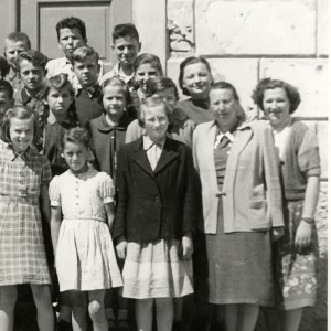 Učenci 1.a razreda nižje gimnazije so se slikali na stopnicah pred vrati stare šole na Partizanski ulici v Cerknici. V tem letu sta bila na šoli dva prva razreda, naslednje leto pa so jih združili v enega, katerega smo že predstavili. Lepo bi bilo dobiti še sliko 1.b iz istega leta.