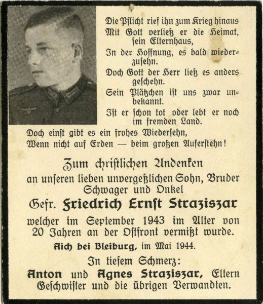 ki je bil septembra 1943 v starosti 20 let pogrešan na vzhodni fronti.