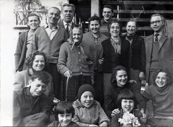Na domačem dvorišču ob osemdesetletnici moje stare mame Antonije Udovič. Slivice, marec 1965.