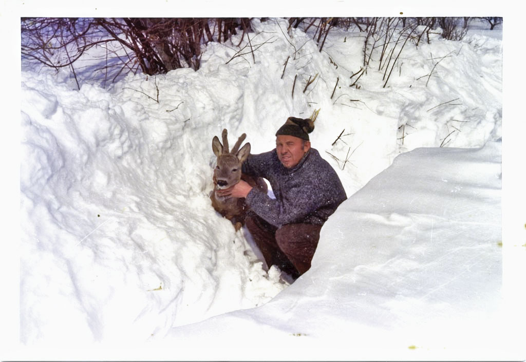 Gotovo se še marsikdo spomni, kako je bila zima leta 1976 najprej precej suha, potem pa je okoli 8. marca zametlo skoraj en meter snega, ki je povzročil veliko nevšečnosti ljudem in živalim. Na sliki, ki jo je domnevno posnel Marjan Kržič, sta avtoprevoznik Jože Strle in srnjaček, ki se je v visokem snegu znašel na njegovem dvorišču. Stisnila sta se v ozko gaz v snegu, ki na debelo pokriva vse naokoli.