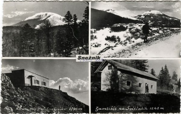 Razglednico Snežnika je 1962 iz Ilirske Bistrice poslalo dekle (imena ne razberem jasno) prijateljici v Stari trg. Notranjski Snežnik, dvoglavi vrh (Veliki Snežnik 1796 m; Mali snežnik, 1694 m) je najbolj južna gora tolikšne višine. Samo zaradi precejšnje odmaknjenosti na jug ta najvišji zunajalpski vrh ni vključen v Slovensko planinsko pot, ki poteka od Nanosa čez Slavnik k morju.