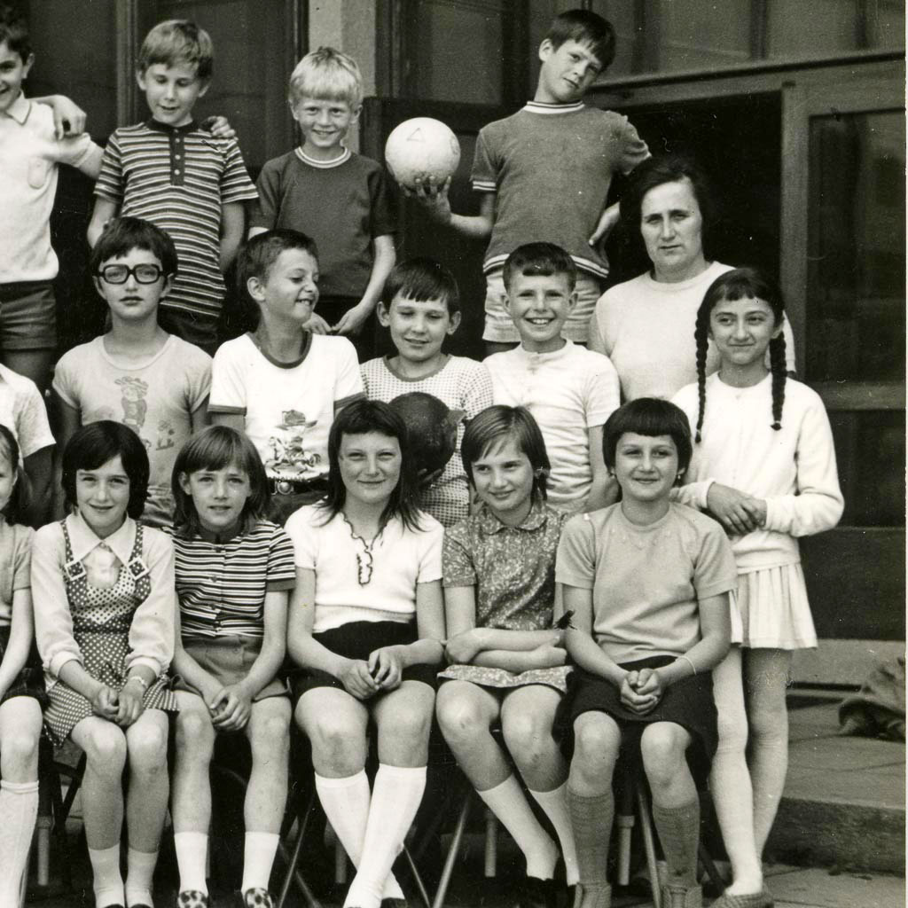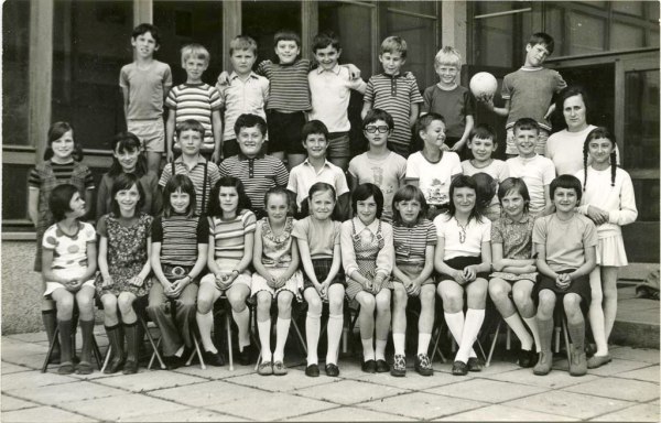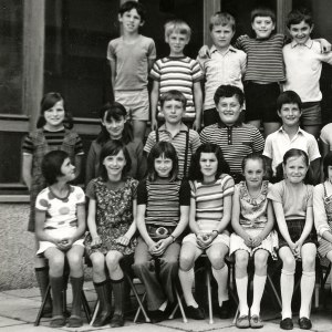 Razredničarka Milka Manfreda s svojimi učenci 4. b razreda v šolskem letu 1973/74.