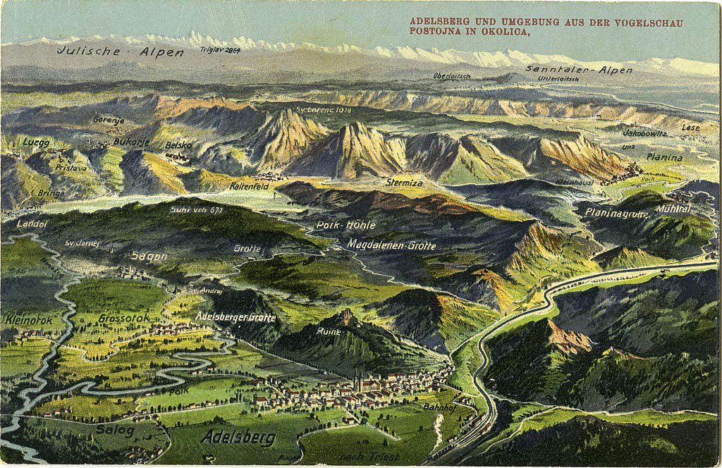 Na Soviču še stojijo ostanki gradu. Postojna je narisana »po spominu«. Nekaj hiš, ki so tedaj že stale, manjka, cerkev bi morala biti na vzpetini. Razglednica je nastala med prvo svetovno vojno, ko je Postojna čez noč postala vojaško mesto. Tu je stanovalo tristo častnikov, da vojaštva niti ne omenjam. Zgrajenih je bilo mnogo barak. Na kolodvoru je bila pekarna in od tam so komis vozili na fronto z vlaki ali vozovi. Pri Krajnarjevem mlinu so postavili barake in klavnico. Pri ljudski šoli so zgradili oficirsko kavarno in veliko ter lepo častniško jedilnico. V Stari vasi so naselili obrtnike: kovače, ključavničarje, mizarje in druge. Največ dela je bilo s popravljanjem vojaških vozov. Pri delu so pomagali ruski ujetniki. Tradicionalne vrednote, predvsem moralne, so se med vojno razblinile. Število nezakonskih otrok je naraslo, posledično pa tudi število detomorov in spolnih bolezni. Župnik Ažman je zapisal: “Škoda v moralnem oziru je bila nenadomestljiva. Notranjska je bila nekoč vzor v dostojnem življenju, sedaj pa je po zdravniških trditvah, bila preplavljena z veneričnimi boleznimi. Od začetka vojne do konca 1917 se je v postojnskem kraju rodilo 12 nezakonskih otrok. Ena od domačink je nezakonskega otroka rodila na kolodvorskem stranišču in ga tam tudi pustila. Vendar je čudno, da so vsi ti nezakonski otroci po pravilu pozneje umrli.” Tako je namignil, da je šlo najverjetneje za detomore, pri čemer pa Postojna ni bila izjema.