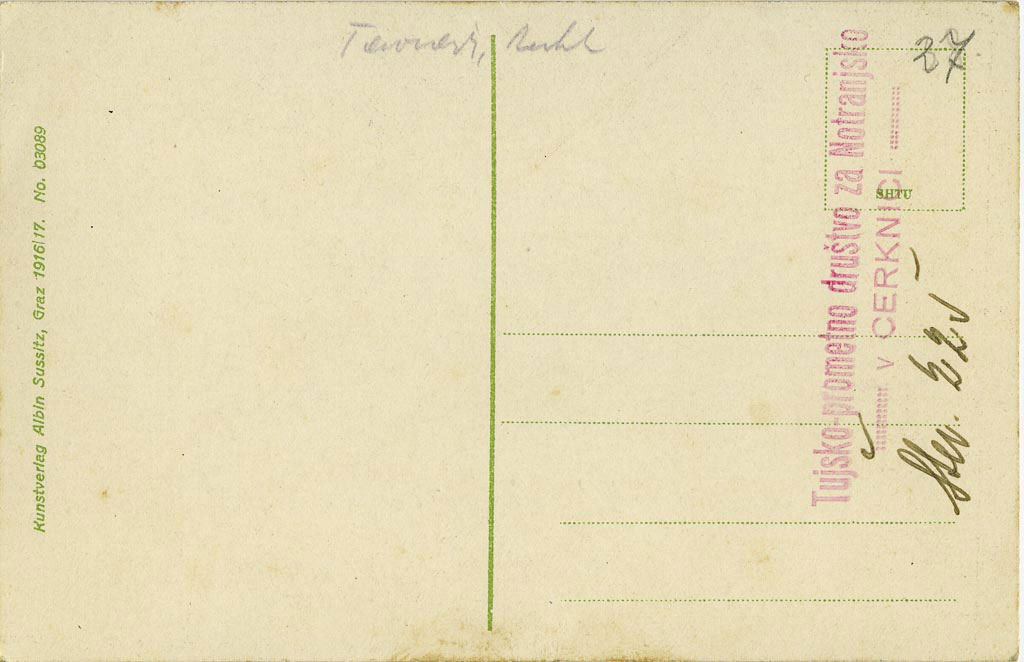 Razglednico je založil Albin Sussitz iz Gradca v letih 1916/17. Prav takšno, morda malo bolj v rumenih odtenkih, smo našli v domačem arhivu. Pripada istemu založniku, izdana pa je bila v letih 1913/14.