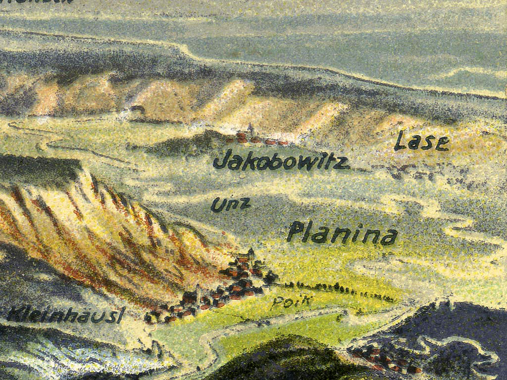 Postojna z okolico je barvna litografija. Narisana je, zato kakšen detajl ne sovpada z dejanskim stanjem na terenu.