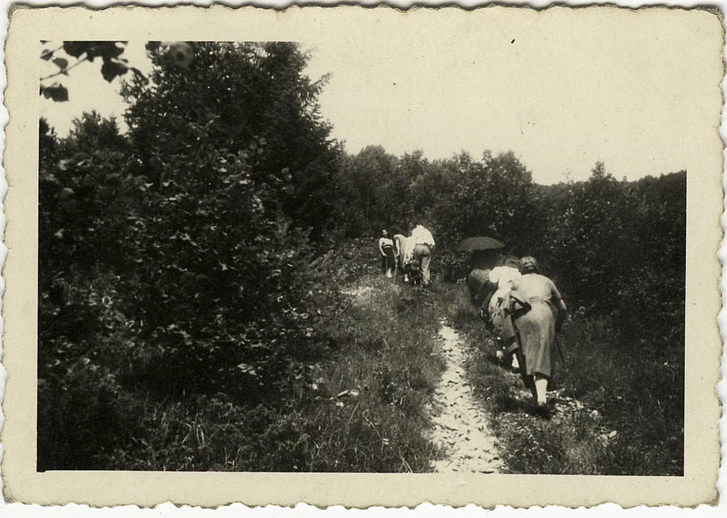 Iz bogate zbirke Jerneja Malovrha je tudi ta slika pohodnikov na hrib. Morda gredo na Slivnico. Črna marela je služila za senco, tam kjer je le-ta že bila pa za oporo pri hoji.