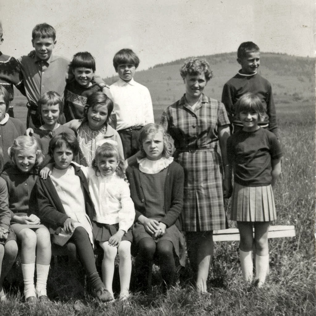 Učenci 3. razreda osnovne šole Nova vas v šolskem letu 1968/69 ob svoji razredničarki Bronislavi Žurga.