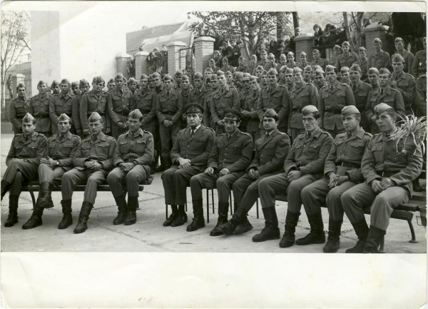Na sliki so statisti v filmu Ko bom mrtev in bel. Slika je nastala na snemanju scene, ko pred zbranimi vojaki poje Džimi Barka. Eden med statisti je Franc Mihelčič. Film so snemali v Beogradu, morda še v katerem drugem kraju – ni mi uspelo ugotoviti. Kader, iz katerega je fotografija, lahko pogledate na tej povezavi.