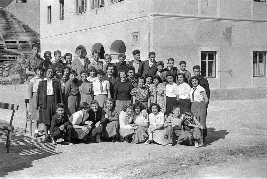 Zdi se, da gre za zaključek šolanja, vsaj starost mladine na sliki namiguje na to. Fotografiranje je bilo najbrž napovedano, saj so dijaki v lepih oblekah in dekleta posebno lepo sfrizirana … ni pa šopkov ali kakšnih drugih atributov, ki bi kazali na to, da gre morebiti za zadnji dan šolanja na Nižji gimnaziji. Mala matura je sodila v ta čas, se mi zdi. Zna še kdo pojasniti, kako je potekal zaključek osnovnega šolanja pred nastankom osemletke?