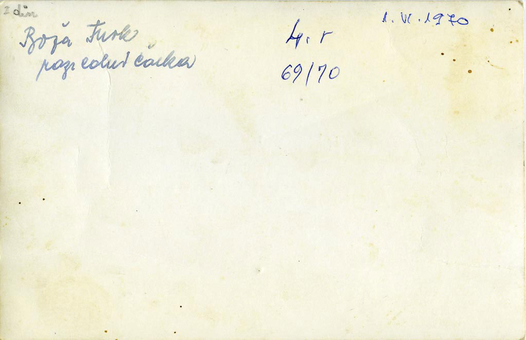 Podpis razredničarke, dopisana razred in šolsko leto in celo datum slikanja 1. 6. 1970. Skrajno levo zgoraj pa vidimo celo takratno ceno za sliko 2 din.