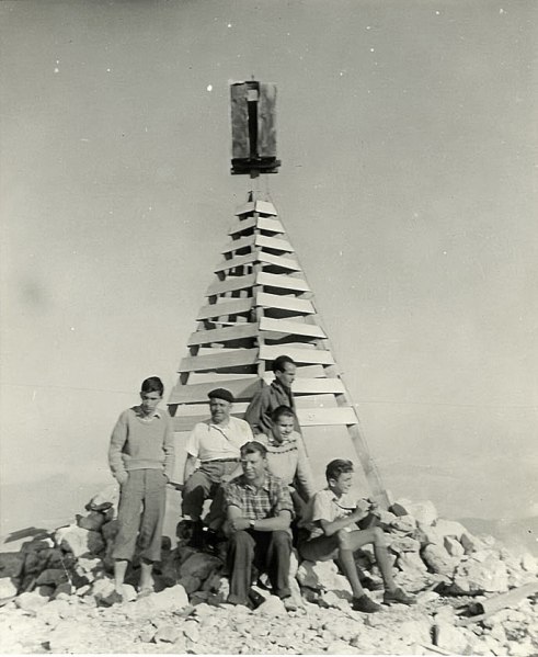 Na sliki prepoznam svojega očeta Franca Mazija z baretko in pred njim sprevodnika avtobusa Janka Pegana. Na vrh peljeta dve glavni poti, imenovani Slovenska in Italijanska. Prva, primernejša za vzpon, gre skozi grapo strmo navzgor ob klinih in jeklenicah, je varna, a ni za vrtoglave, Italijanska pot, primernejša za spust, je položnejša in teče po severni strani že po italijanskem ozemlju, saj je na vrhu meja med državama. Ker je severni del zasnežen pozno v poletje, del te poti pa preči strmo plazišče, je vsak zdrs lahko usoden. Vzpon po eni ali drugi poti traja približno poldrugo uro, je pa poplačan z enim najlepših razgledov v naših gorah. Vidijo se Jalovec, Triglav, Krn pa Viš in Montaž, spodaj na italijanski strani še kot ribji očesi Mangartska (Belopeška) jezera. Obiskovalci na sliki so morali imeti veliko željo doseči ta vrh, kar v tistem času in v takratnih obuvalih ni moglo biti lahko. Za vedno se me je dotaknilo, ko mi je oče, takrat 11 – letnemu fantiču, zaneseno opisoval pot in razgled z vrha. Star 52 let, obilnejše postave, o naporih in težavah vzpona po mojem spominu ni govoril.