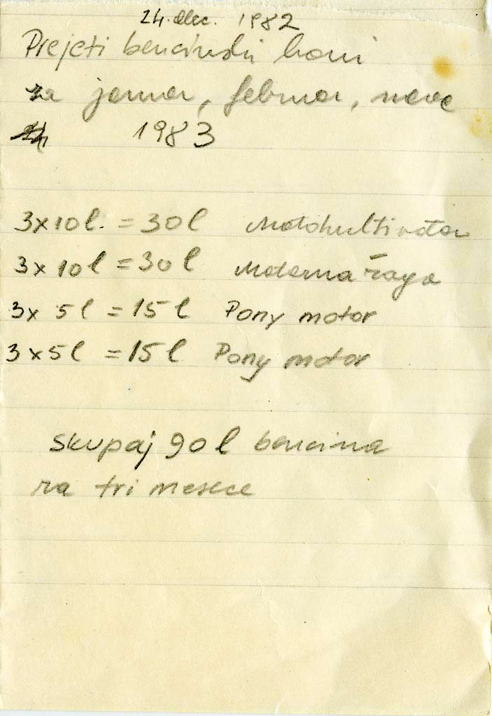 Listek pojasni, kako smo prejem bonov utemeljili z vsem, kar je bilo poleg avtomobila, za katerega je pripadalo 40 litrov goriva, še motornega pri hiši: motokultivator, dva pony motorčka (se jim ni reklo pony ekspres?) in motorna žaga. Za vse to skupaj je pripadalo dodatnih 90 l bencina, kot piše na listku …