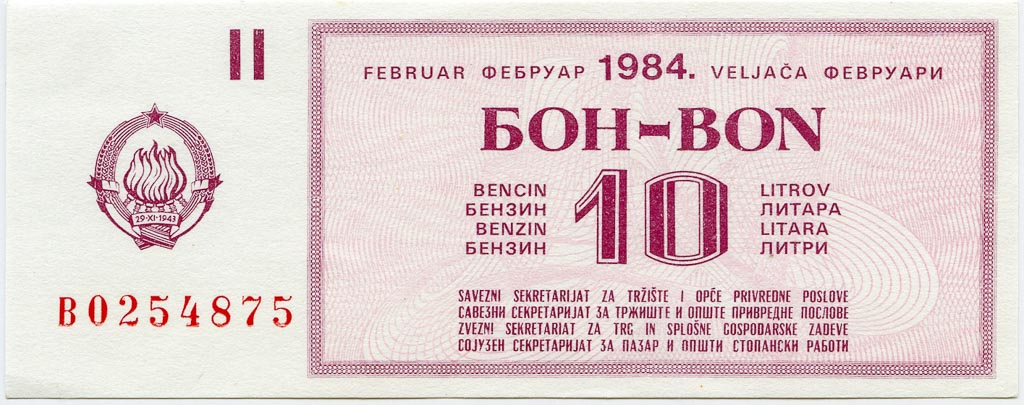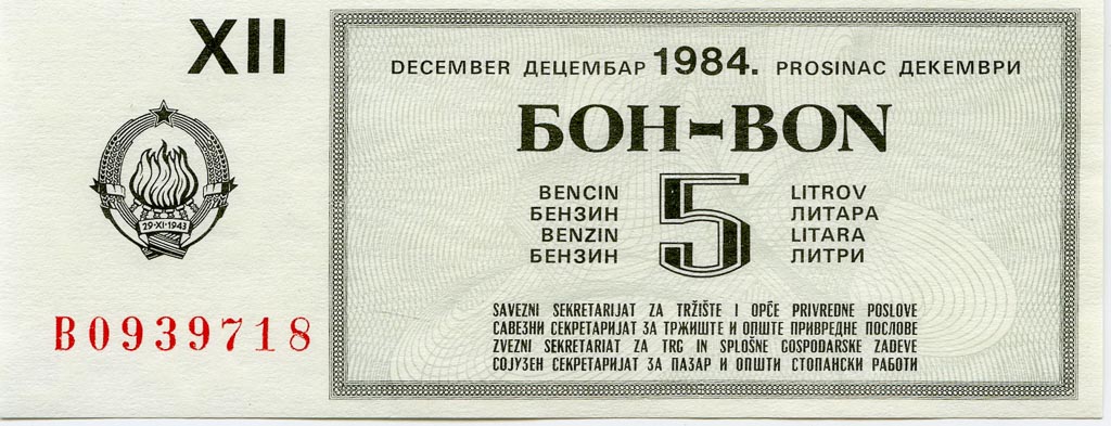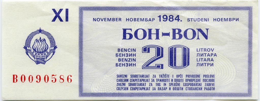 O bencinskih bonih v SFRJ je na tej strani že nekaj napisanega in tudi povedano pravzaprav vse bistveno. Tu pa vidimo še tri takratne bone za bencin, in sicer za 5, 10 in 20 litrov, izpisanih v treh oziroma štirih uradnih jezikih države in dveh pisavah: slovenskem, srbskem, hrvaškem in makedonskem; dva v latinici in dva v cirilici.