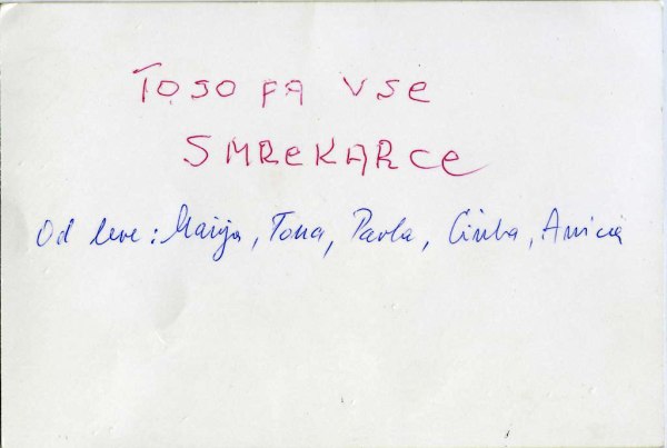 Nekje okoli leta 1980, sodeč po oblekah in vrtu v ozadju pa enkrat v drugi polovici poletja, je neznan fotograf tik pred rojstno hiško, od katere je tu videti le senco, posnel pet Smrekarjevih sester iz Retij, hčera enega zadnjih tkalcev lanenega platna in oprt daleč naokoli. Čez rame so se prijele postavne sestre, ki se takrat že dolgo niso več pisale Košir, od najstarejše do najmlajše: skrajno levo stoji Marija, ki so jo klicali Mima, nato Tona, ki je bila uradno najbrž Antonija, sledijo pa Pavla, Cirila in Anica. Gotovo že dolgo niso bile tako vse skupaj pred rojstno hišo, zato je to poseben trenutek. Samo Marija je ostala v rodnem Loškem Potoku, vse ostale so šle za delom in ljubeznimi po svetu. Tona je živela v Kočevju, Pavla, ki je bila poročena z muzikantom, članom ansambla Veseli planšarji, v Ljubljani, Cirila v Izoli in Anica v daljni Kanadi. Vse so danes že pokojne, le Anica še živi.