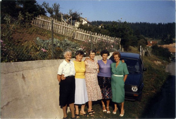 V ozadju stoji avtomobil, s katerim se je najbrž pripeljala ena od njih, malo višje se vidi nekaj retjanskih hiš, na obzorju pa gozdovi vzhodno od Retij.