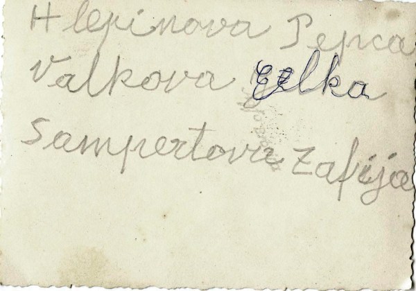 Na tej sliki prepoznam desno dekle iz prispevka 1938 Podcerkev – Družba na motorju in okoli njega, kot Pepco Truden, fotografovo sestro, kar potrjuje tudi napis na hrbtni strani slike, ki našteva dekleta od desne proti levi.