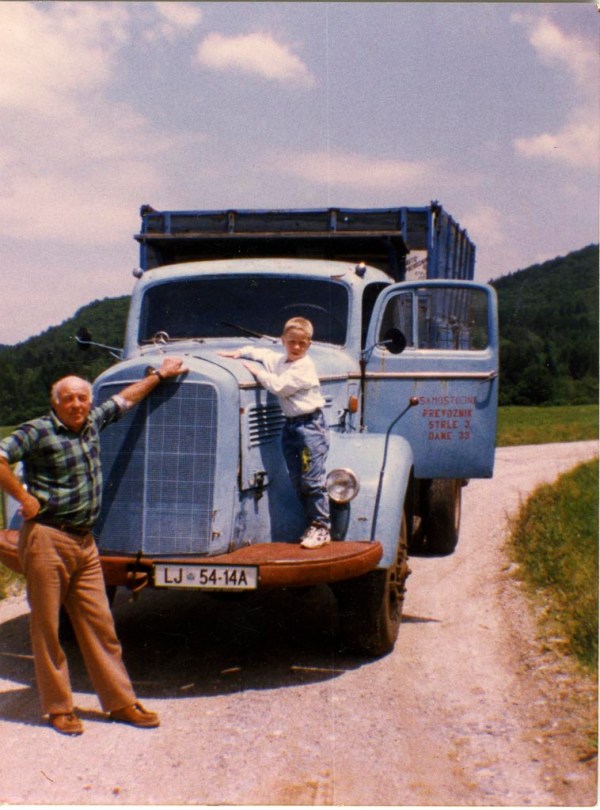 Šofer in lastnik ob mercedesovem kamionu, junija 1996. Zdi se, da je isti kakor na gornji sliki. Na vratih se vidi napis “Samostojni prevoznik Strle J. Dane 33” … (Kako je pa že bilo tisto, ko so morale delovne organizacije nekaj čas imeti na vozilih napis “Samo za lastno uporabo?!…) To je bil Jožetov zadnji kamion pred upokojitvijo. Nekaj časa je imel dva hkrati, skupaj pa štiri po vrsti.